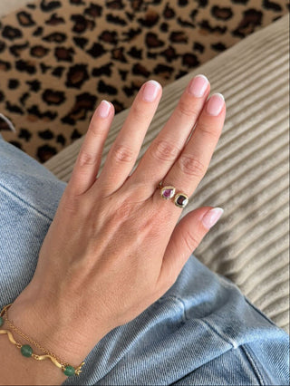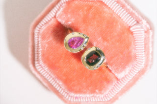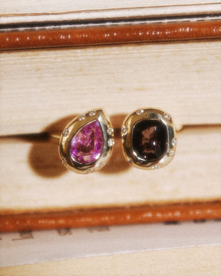 Et une bague bicolore en argent 925 et or 9 carats, ornée d’améthyste rose et de grenat.