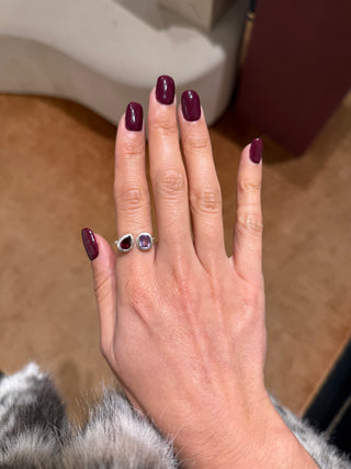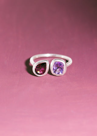 Une bague en argent 925 sertie d’améthyste et de grenat,