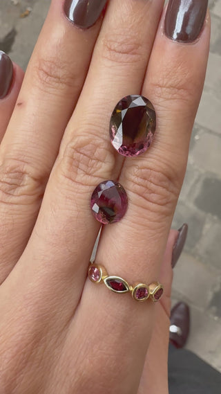 Un cercle infini de lumière et de couleur. La bague Eternité s’habille de Spinelles roses soigneusement sélectionnés, aux nuances profondes et vibrantes, sertis dans l’or 9 carats. Alternant tailles ronde, poire ou marquise, les pierres dessinent un rythme délicat, à la fois moderne et intemporel.