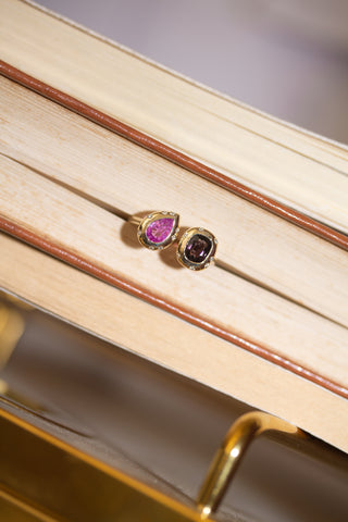 La bague unit un saphir rose taille poire et un spinelle prune, sublimés par l’éclat délicat de diamants blancs sertis sur un or 9 carats lumineux. Une création féminine, entre force et douceur, audace et émotion.